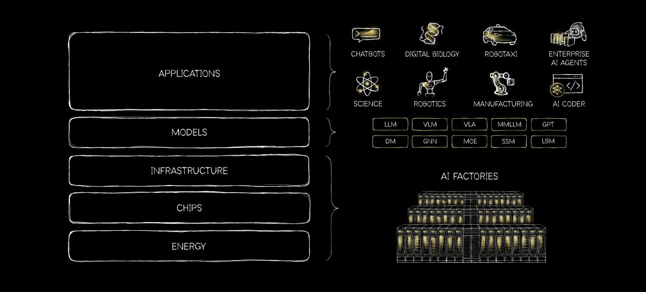 黄仁勋将AI架构分解为自下而上的五层:
